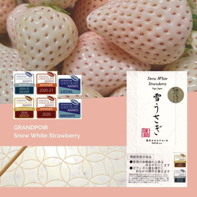 ※インターナショナルチョコレートアワード2020-21世界大会で「銀賞」、さらに地元の特産品を用いて開発した商品ということで「ローカル賞」も受賞しました。 ※インターナショナルチョコレートアワード2020アジア-パシフィック大会で「金賞」、さらに新たな技術を用いて開発した商品ということで「イノベーション賞」も受賞しました。 ※インターナショナルチョコレートアワード2019アジア-パシフィック大会で「銀賞」、さらに地域の特産品を用いて開発した商品ということで「特別賞」も受賞しました。その後、世界大会に進出し、「銅賞」を受賞しました。 ~~~~~~~~~~~~~~~~~~~~ ●商品説明● グランポワールビーントゥバーチョコレートに続き、雪うさぎ白いちごチョコレートも機能性表示食品となりました。(消費者庁届出番号 I517) 食後血糖値の上昇をゆるやかにし、腸内環境を整えます。 機能性成分の食物繊維(イヌリン)は食後の血糖値の上昇をゆるやかにすること、善玉菌の一種であるビフィズス菌を増やし、腸内フローラを整えることでお通じを改善しおなかの調子を整えることが報告されています。 日本で5農家でしか栽培されていない佐賀県唐津産の希少品種「雪うさぎ(白いちご)」。 一般的な白い苺と異なり、大粒で透き通るような白さの中に種の紅色が映えて、香り高いことが特長です。 高級品の白いちごは贈答品として重宝されています。 その高級白いちごを贅沢に安心安全未精製のカカオバターにふんだんに練り込みました。 甘味は、白いちごの華やかな香りを引き立てるために、マクロビで身体を温める糖質として位置付けられている甜菜糖を使用しました。 フルーツを練り込むチョコレートは一般的に粉乳を使用してフルーツミルク味にしたものが多いのですが、高級白いちごの風味をダイレクトに味わっていただきたいので、乳を一切使わないフルーツクーベルチュールチョコレート品質に仕上げました。 大切な方へのギフトとして、また、ご自身へのご褒美として、高級白いちごのグラマラスな風味をお楽しみください。 心を込めて・・・ 美味しく、楽しく、美しく、心と身体に優しい 至福のひとときをお届けいたします。 ~GRANDPOIR グランポワール~ ~~~~~~~~~~~~~~~~~~~ 【糖質カット率】30%糖質カット※ 【食物繊維量】4倍量※ ※日本食品標準成分表2015年版(七訂)ミルクチョコレートと比較 ~~~~~~~~~~~~~~~~~~~~ 【名称】チョコレート 【原材料】カカオバター(コロンビア産)、食物繊維(イヌリン)、白いちご、有機甜菜糖、有機ココナッツオイル、白きくらげ末 【内容量】1枚 標準50g 【サイズ】縦14cm×横7cm×厚み5mm 【賞味期限(未開封)】製造から10ヶ月 【保存方法】直射日光、高温多湿を避け、20℃以下の冷暗所で保存してください。 【一日摂取目安量】25g(1/2枚) 【摂取方法】そのままお召し上がりください。 【摂取上の注意】本品は、多量摂取により疾病が治癒したり、より健康が増進するものではありません。また、摂り過ぎ、あるいは体質・体調により、おなかがゆるくなる可能性があります。一日摂取目安量を守って、お召し上がりください。 【届出表示】本品にはイヌリンが含まれています。イヌリンは食後の血糖値の上昇をゆるやかにすること、善玉菌の一種であるビフィズス菌を増やし、腸内フローラを整えることでお通じを改善しおなかの調子を整えることが報告されています。 【届出番号】I517 ●本品は、卵、落花生、くるみ、カシューナッツ、アーモンドを含む商品と共通の設備で製造しています。 ●開封後はお早めにお召し上がりください。 ●チョコレートは高温になると油脂分が溶け、冷えて固まると白くなることがあります。風味は劣りますが、召し上がってもさしさわりはありません。 ●本品は、疾病の診断、治療、予防を目的としたものではありません。 ●本品は、疾病に罹患している者、未成年者、妊産婦(妊娠を計画している者を含む。)及び授乳婦を対象に開発された食品ではありません。 ●疾病に罹患している場合は医師に、医薬品を服用している場合は医師、薬剤師に相談してください。 ●体調に異変を感じた際は、速やかに摂取を中止し、医師に相談してください。 ●本品は、事業者の責任において特定の保健の目的が期待できる旨を表示するものとして、消費者庁長官に届出されたものです。ただし、特定保健用食品と異なり、消費者庁長官による個別審査を受けたものではありません。 ●食生活は、主食、主菜、副菜を基本に、食事のバランスを。 ※赤い粒は白いちごの種です。 ※雪うさぎ(白いちご)はテントウムシや納豆菌など用いたり、防除のために必要最低限農薬を使用する、減農薬で栽培されています。 ※雪うさぎ(白いちご)は農産物のため、時期によって風味が若干変動しますのでご了承くださいませ。